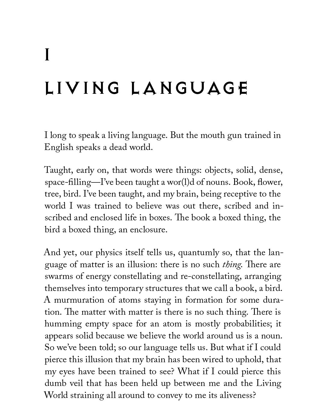 And so we don’t have a word in English for the color of sunlight filtered through leaves, despite the fact that this green gold color is our primal evolutionary homescreen– what do you think we were looking at for the millions of years before we came down from the trees seven million years ago? (see komorebi in Japanese). When we greet somebody, we do not say– Hello my other self, despite the fact that at some existential level that’s what a greeting between two members of the same species always means. (See Aang Waan in Unangan.) Our word for meditation doesn’t mean- bring your heart to it- despite the fact that this is part of what meditation means. (See Lasser Lev in Hebrew.)