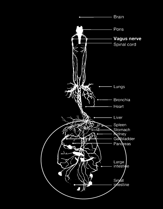 If you go out looking for a decent illustration of the Vagus, you are going to find something about like this. Pay attention in particular to the circled area at bottom, which is the subdiagphragmatic Vagus. This is what we refer to as the Grounding System, what Porges calls Dorsal Vagal. It is largely unmyelinated.