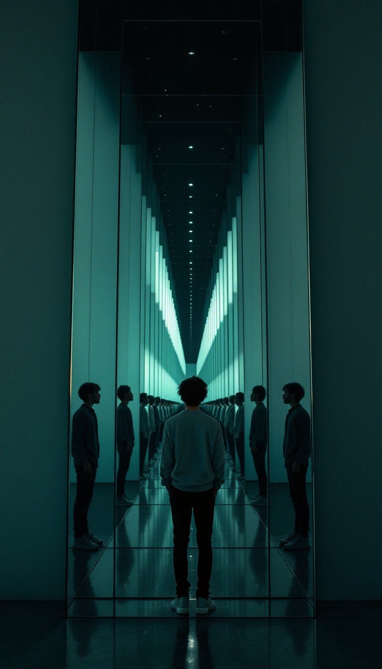 Have you ever happened to stand between two parallel mirrors, and caught a glimpse of yourself infinitely refracted? I did this once, accidentally, toweling off at the YMCA after a swim. There was a part of the men’s locker room where a wall of mirrors above a row of sinks was set in parallel with a full-length mirror on the opposite wall, and I happened to stand between them. What I saw was a bit like the image below. Versions of myself refracting from the primary image into infinite regression.