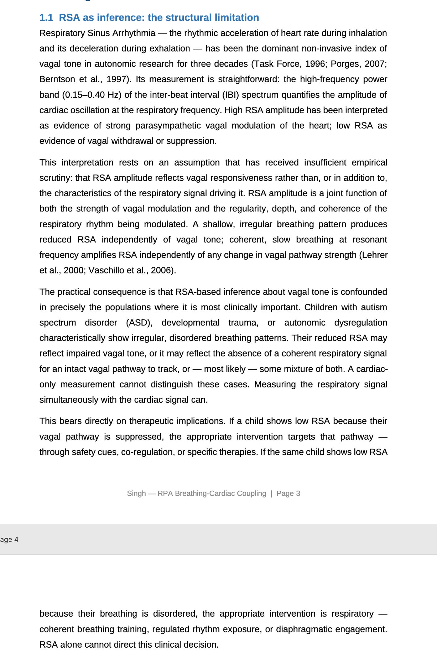 The primary autonomic signal that Stephen W. Porges, PhD used to measure/ organize vagal tone is a cardiac signal called Respiratory Sinus Arrhythmia. “Respiratory Sinus Arrhythmia — the rhythmic acceleration of heart rate during inhalation and its deceleration during exhalation — has been the dominant non-invasive index of vagal tone in autonomic research for three decades (Task Force, 1996; Porges, 2007;Berntson et al., 1997).”4 Grossman is saying that this signal is not a reliable metric of central vagal outflow to the heart (because it is coupled with other systems and feedback loops).5 This is true. RSA is not, in fact, the optimal or primary autonomic signal in the body. This is an accurate methodological limitation – RSA cannot separate respiratory drive from vagal responsiveness, and this is true whether or not PVT’s specific anatomical claims are correct. What is to be done? Porges and colleagues (or someone else, as they don’t seem inclinced to do this) should evaluate the claims of PVT using alternative autonomic diagnostic metrics. WE RECOMMEND USING RESPIRATION.