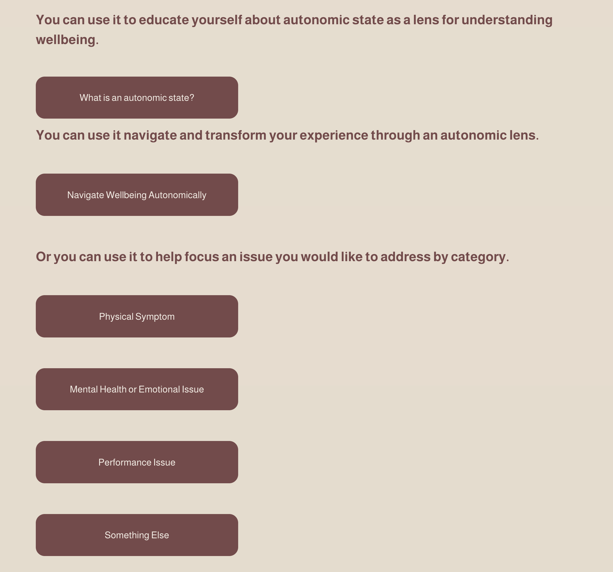 The tool lets you explore your experience through the lens of autonomic state (Navigate Wellbeing Autonomically), through a physical symptom, a mental health or emotional issue, a performance issue, or something else. You can use it to deepen a health-creating state or find ways to change the neural inputs keeping you stuck in a chronic, toxic, or traumatic stress response.
